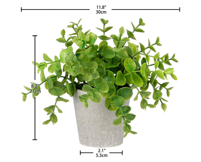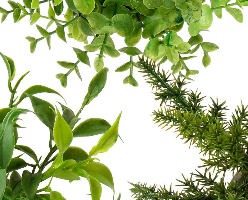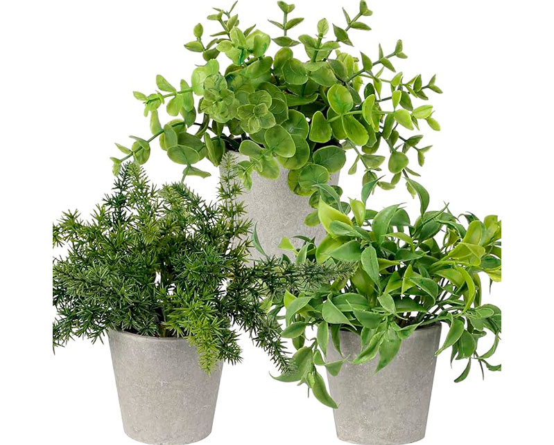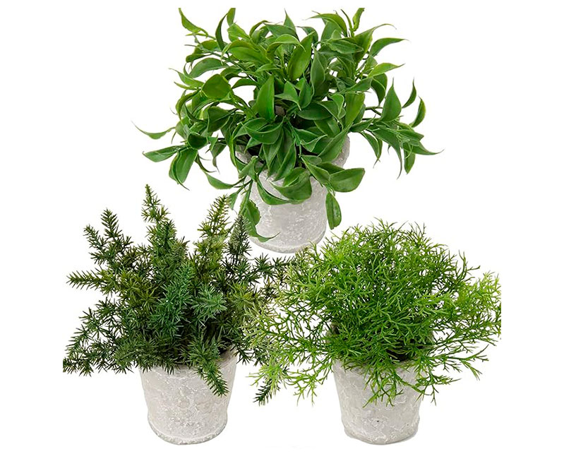 This set of 3 mini artificial evergreen ferns and eucalyptus are supplied in durable and attractive grey cement pots.